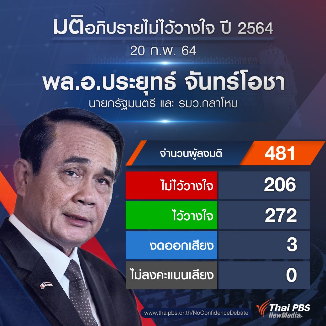 Thai Pbs On Twitter การลงมต อภ ปรายไม ไว วางใจ 10 ร ฐมนตร 20 ก พ 64 1 พล อ ประย ทธ จ นทร โอชา นายกร ฐมนตร และ รมว กลาโหม จำนวนผ ลงมต 481 คน ไม ไว วางใจ 206 ไว วางใจ 272 งดออกเส ยง 3 ไม ลงคะแนนเส ยง 0 อภ ปราย ไม ไว วางใจ Thaipbs Https T